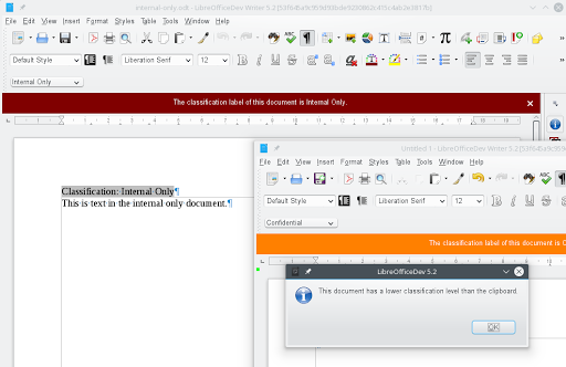 Finally, one feature is that LO knows how secure the document is once it has a classification category, which means a classification scale and level. For two documents that have the same scale, LO can detect if the user would accidentally try to leak sensitive content from a document with higher classification level to a document that has a lower one. This is implemented when copy&pasting: