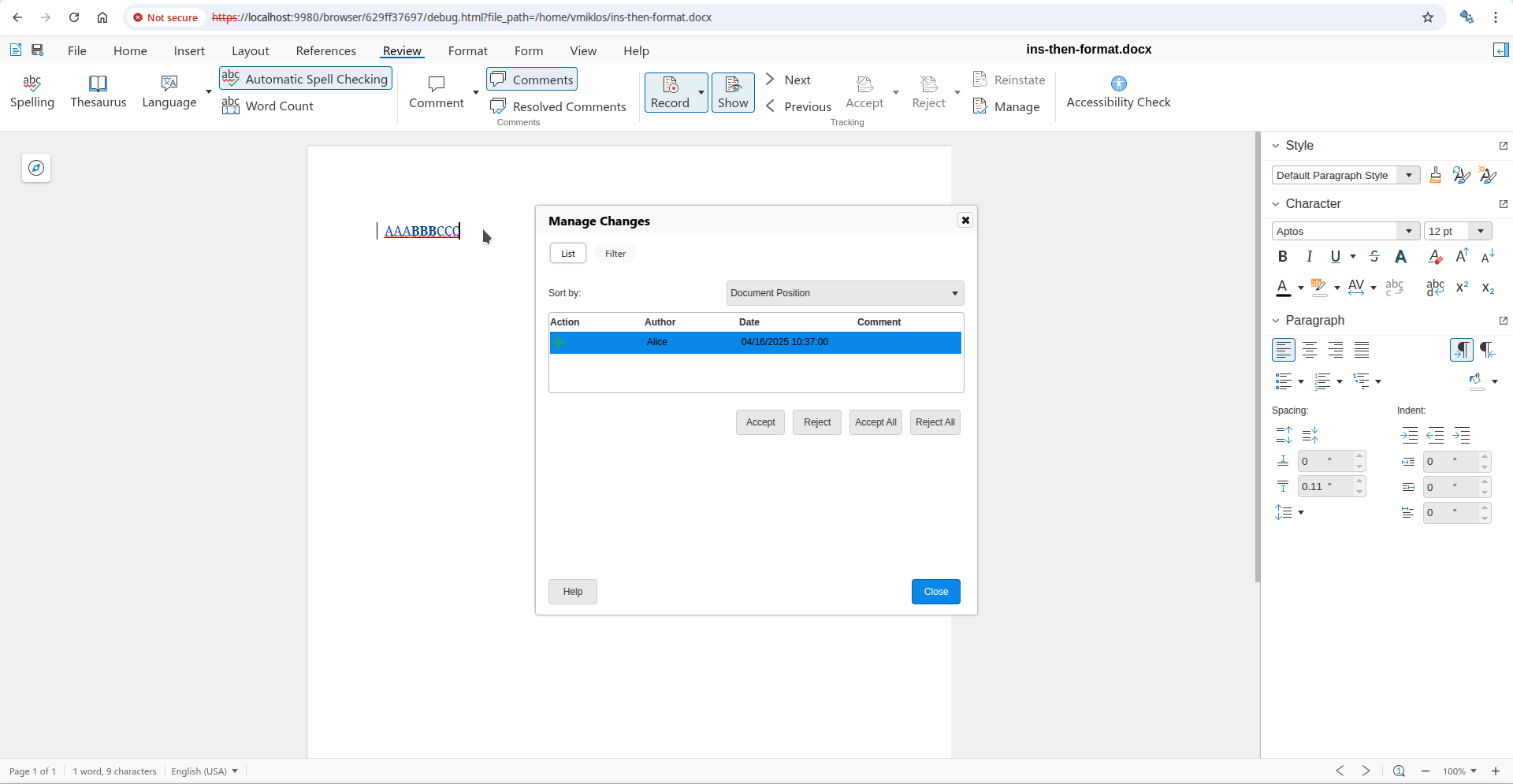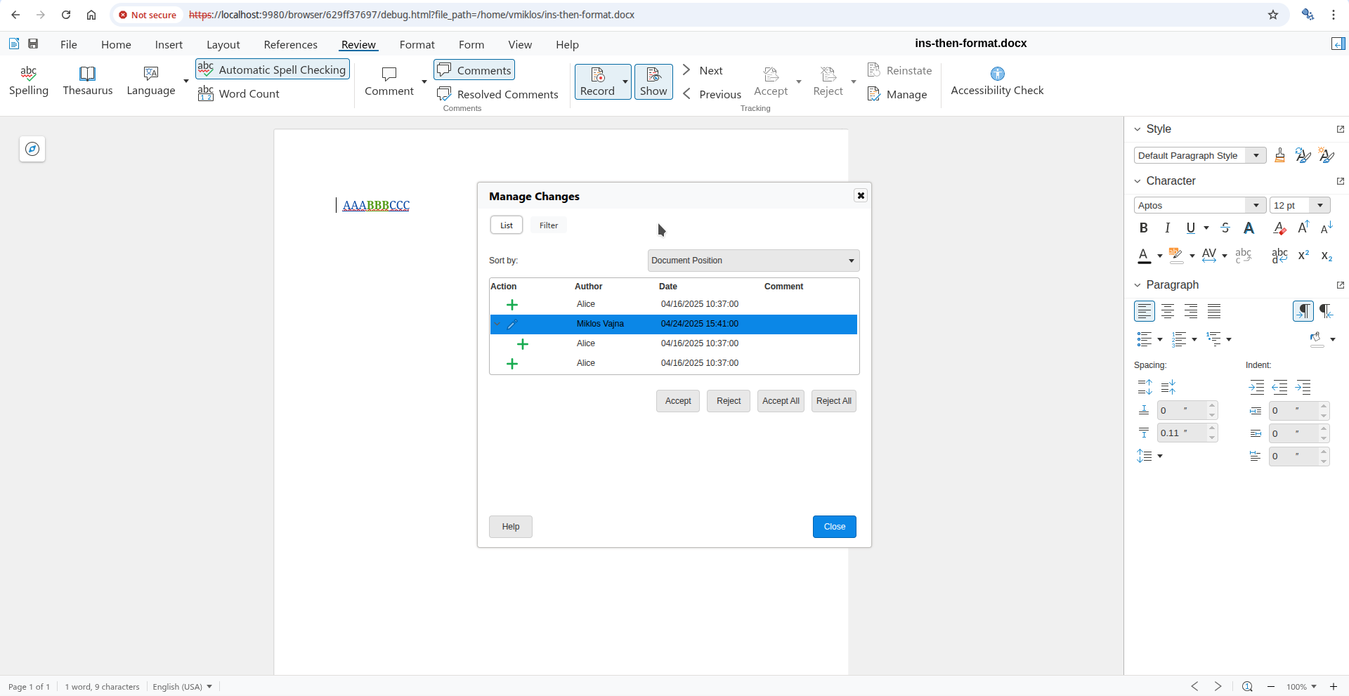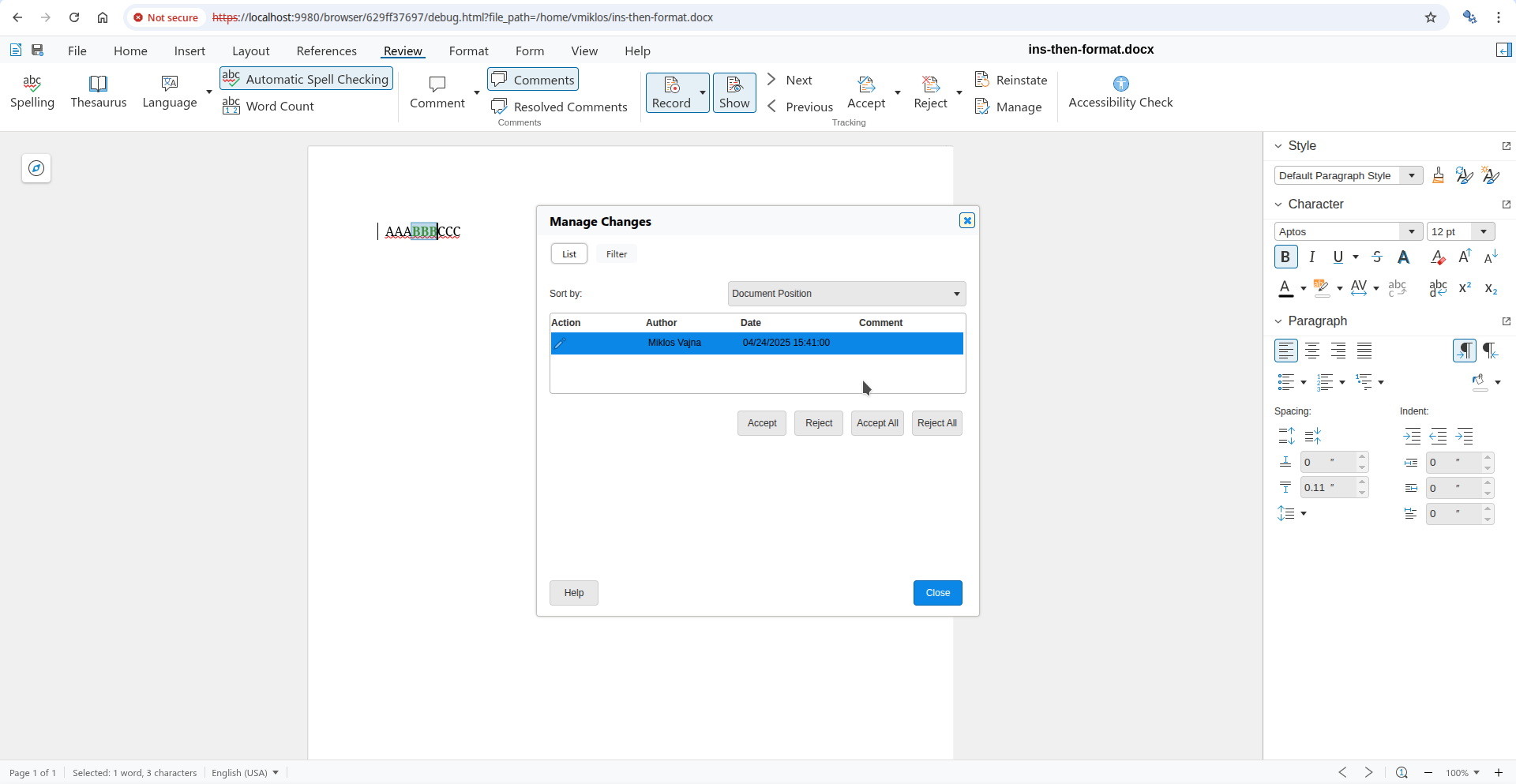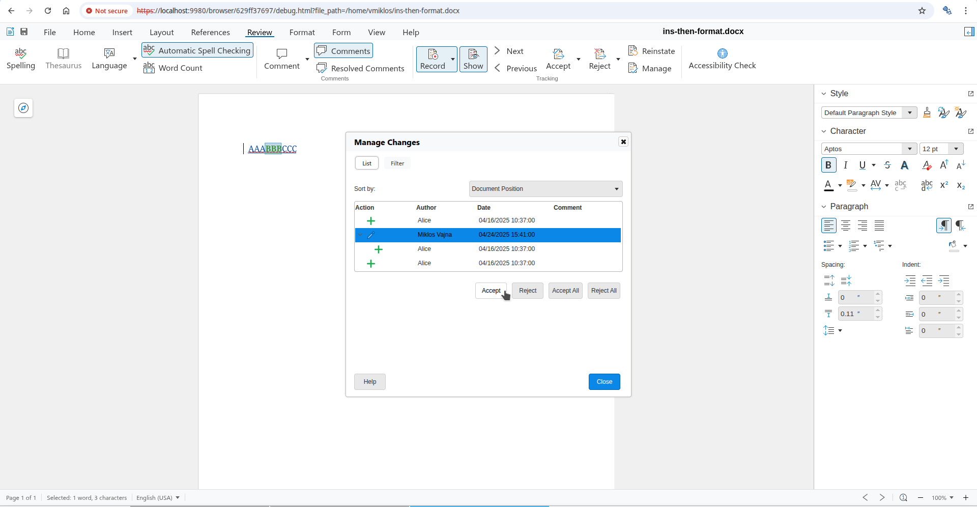 Usually this is what you mean, but what if you want to work on the formatting at the top, directly? You can now open the Manage Changes dialog using the Manage button on the Review tab of the notebookbar and if you go to the formatting change row of the dialog, then pressing Accept there will accept the formatting change, not the insert or delete change. This is possible, because the dialog gives you a way to precisely select which tracked change you want to work with, even if a specific cursor position has multiple tracked changes.